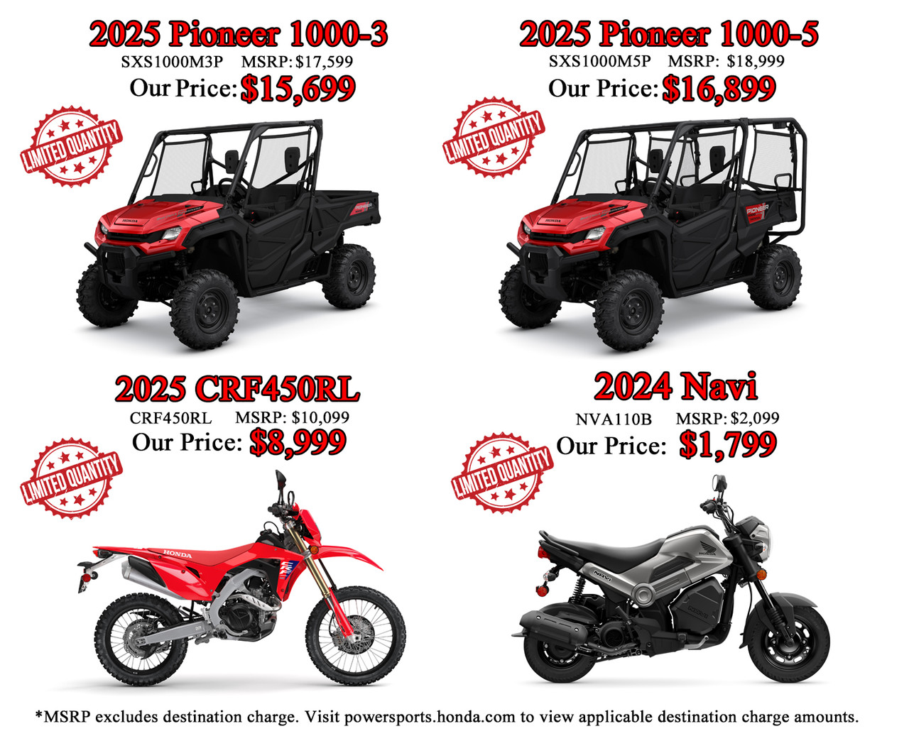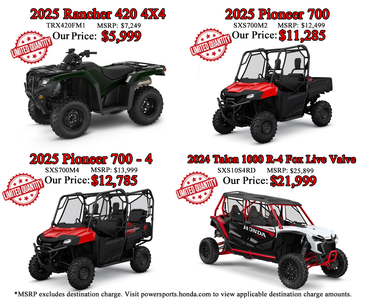 *Suggested Retail Price (SRP) excludes destination charge. Visit powersports.honda.com to view applicable destination charge amount.